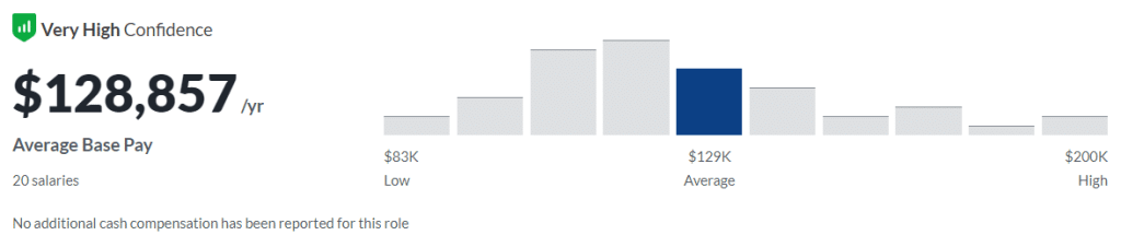 The first, and perhaps most reliable source, is Glassdoor. Their data, updated on March 30th, 2022, shows an average of $128,857 a year.